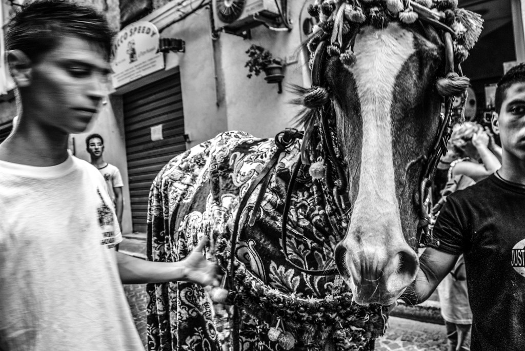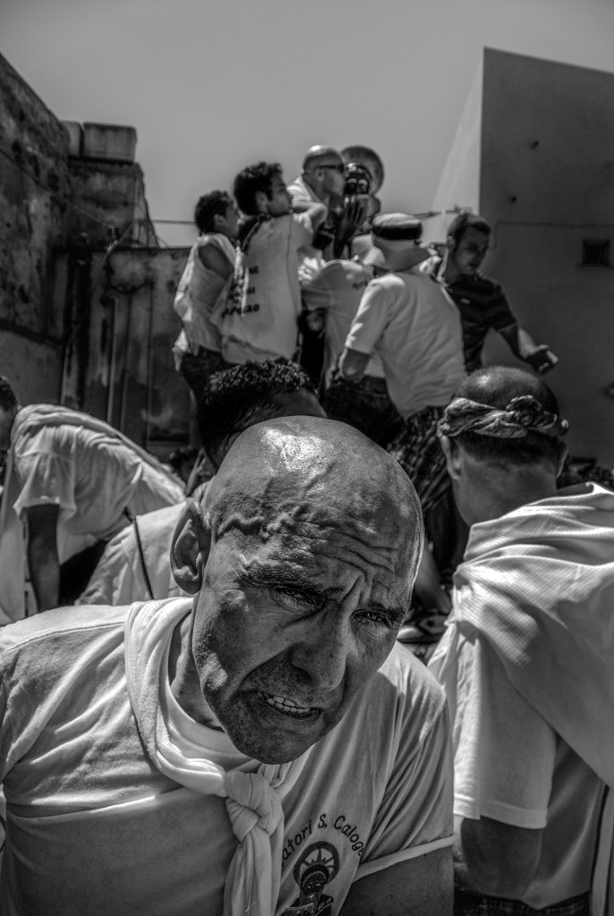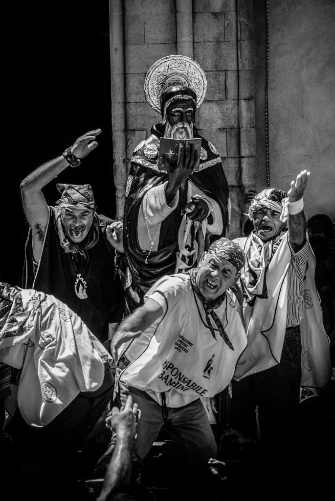 Mi sono ritrovata anni fa a fotografare questa processione ad Agrigento, con alcuni amici fotografi. Come spesso accade al Sud, enorme è la partecipazione dei cittadini, in questo caso per un Santo che non è il loro Patrono, ma che venerano come se lo fosse. I bambini sono issati pericolosamente verso il cielo, a toccare la statua del santo mentre percorre le strade del centro, come forma di benedizione. Tamburiate, bande musicali, carri , rendono questo evento allegro e popolare, una vera festa collettiva.